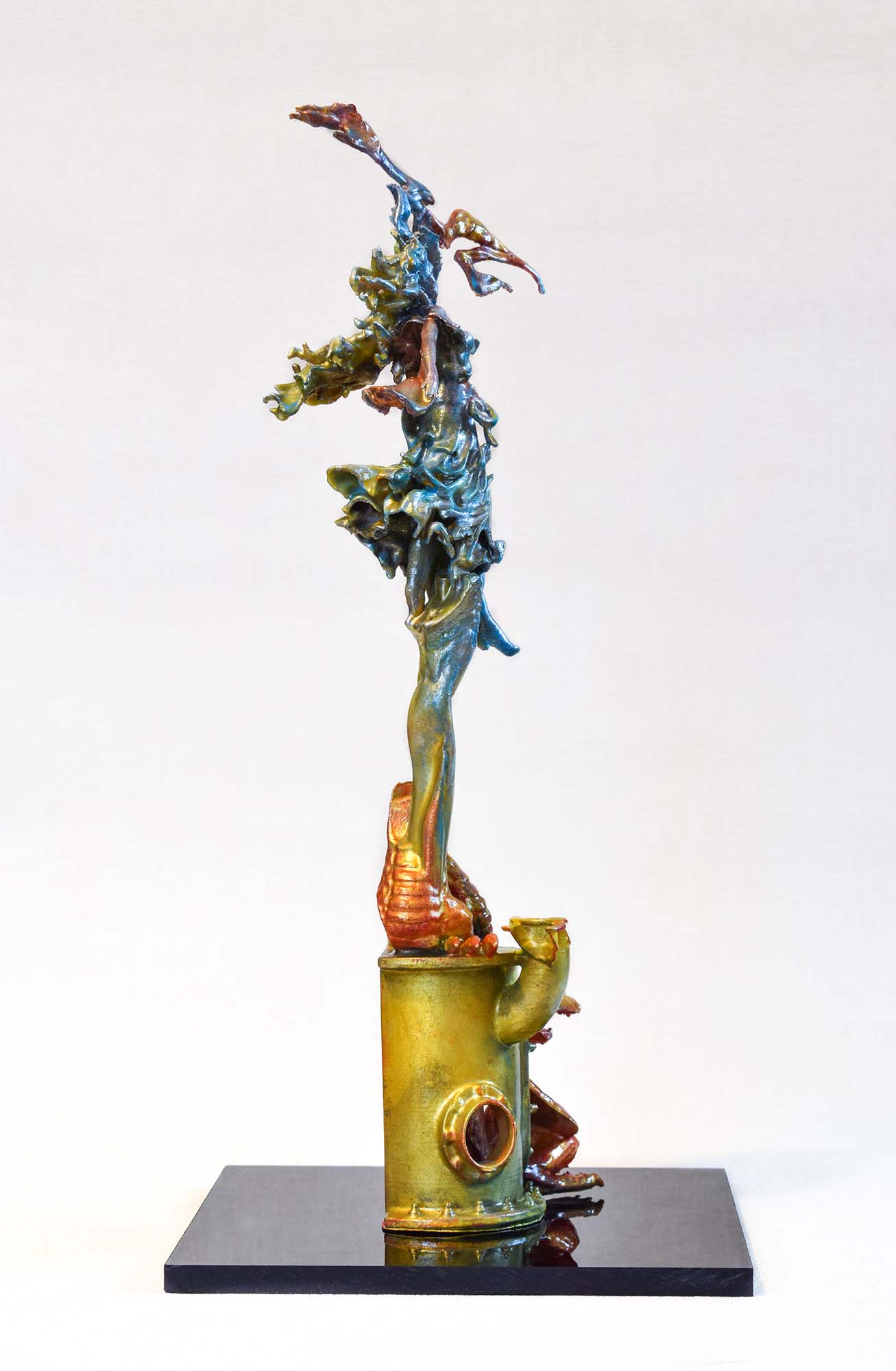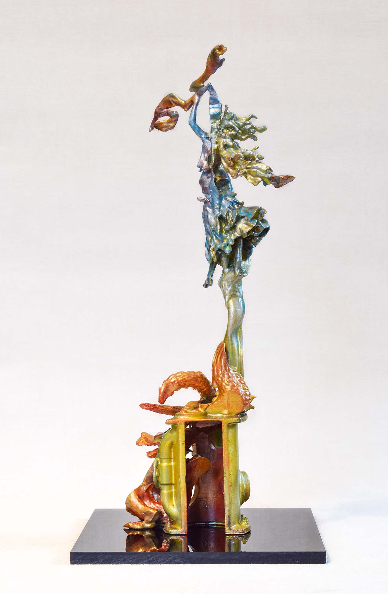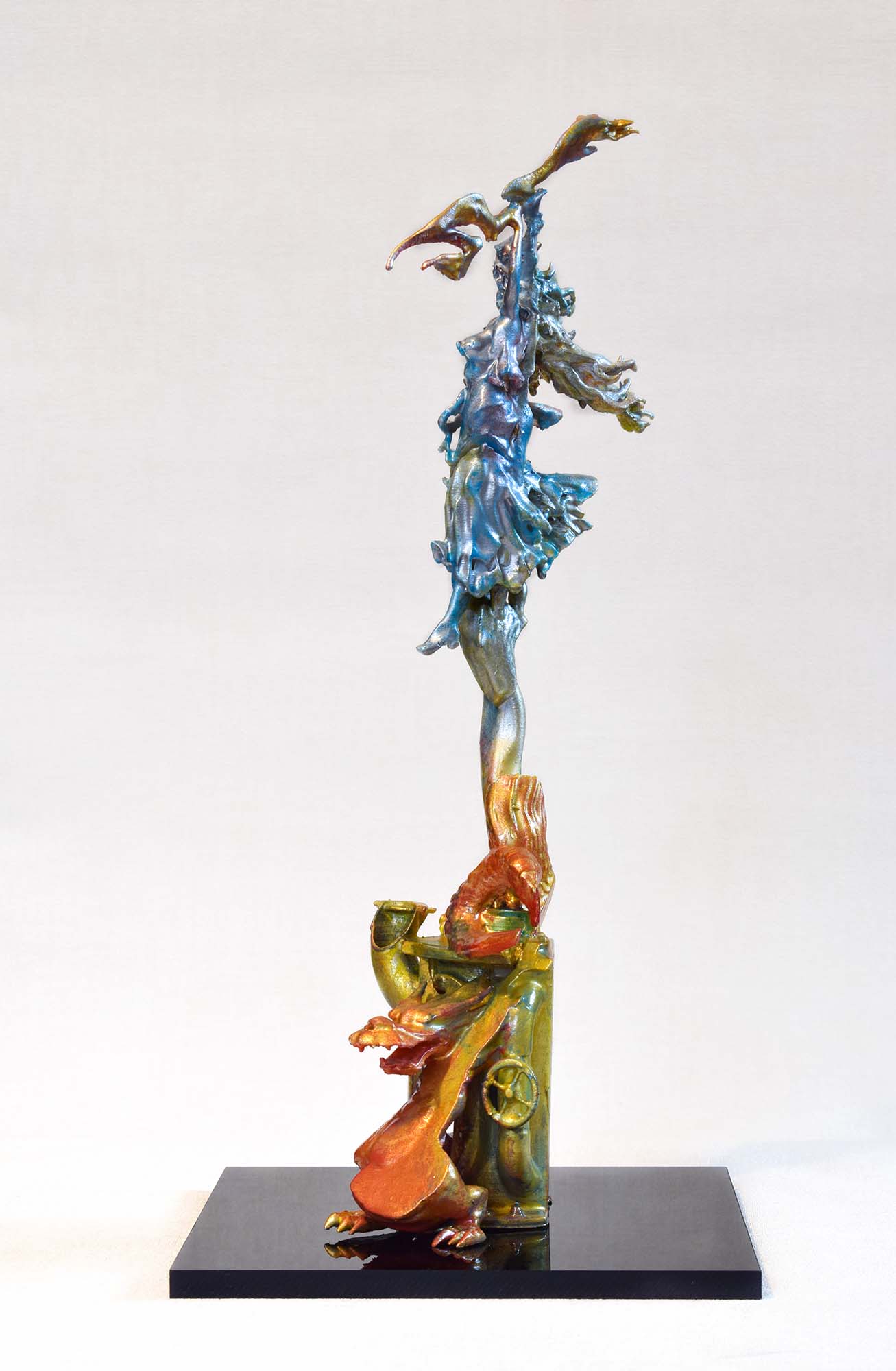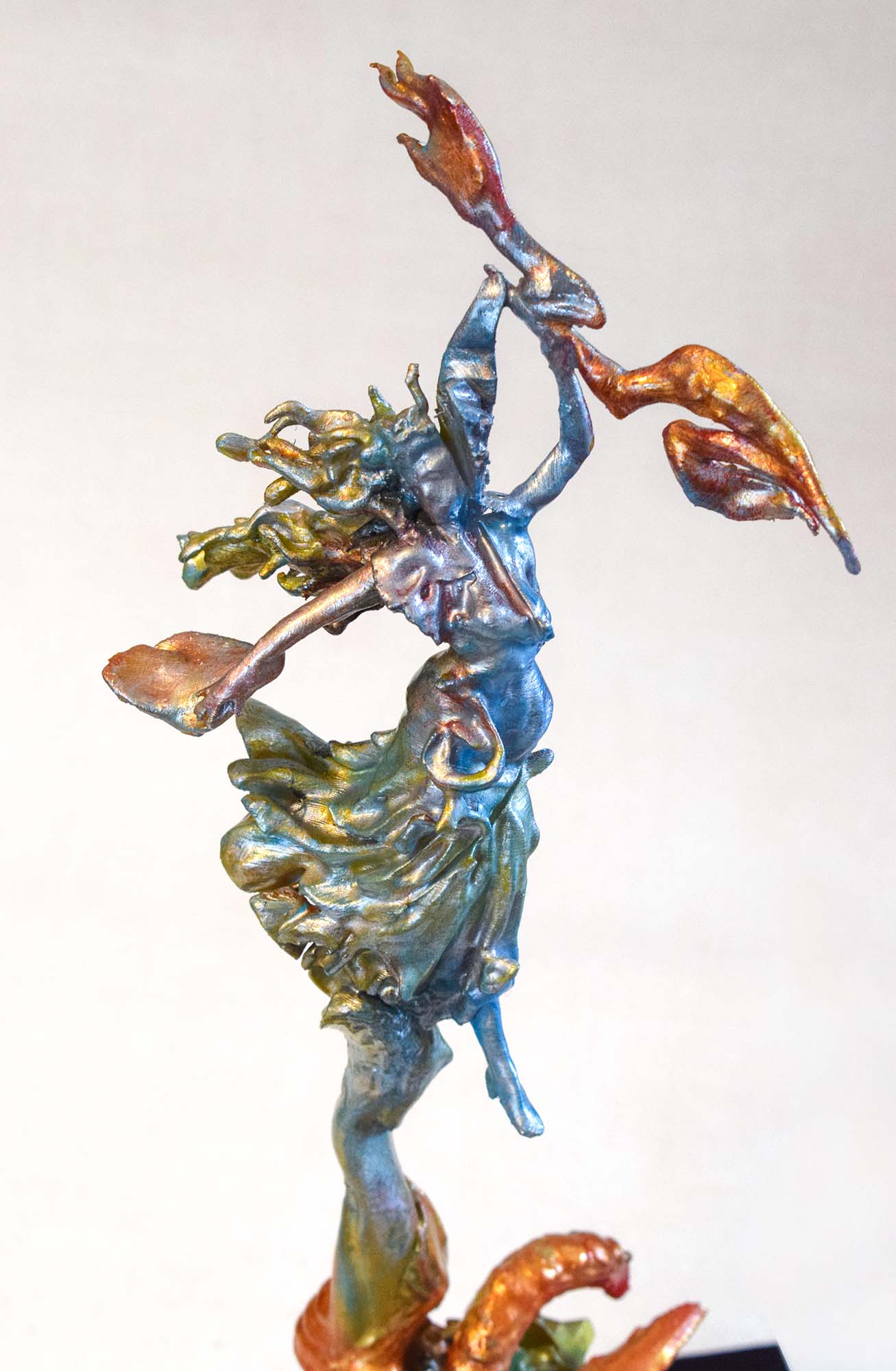 Introducing an extraordinary sculpture that captivates the imagination and invites deeper contemplation. Standing tall with a striking contrast of colors, this piece embodies the dynamic interplay between movement and emotion. The figure, elegantly poised and joyful, seems to dance with the elements, its ethereal form expressing freedom and vitality. The intricate details highlight a masterful craftsmanship, with flowing lines and dynamic textures that draw the viewer's eye. At its base, fantastical creatures emerge, symbolizing the balance of nature and the duality of chaos and harmony. The vibrant hues serve not only to mesmerize but also to evoke a sense of wonder and curiosity. This sculpture is more than just a decorative item—it's a statement piece that ignites conversation and transforms any space into a realm of fantasy.