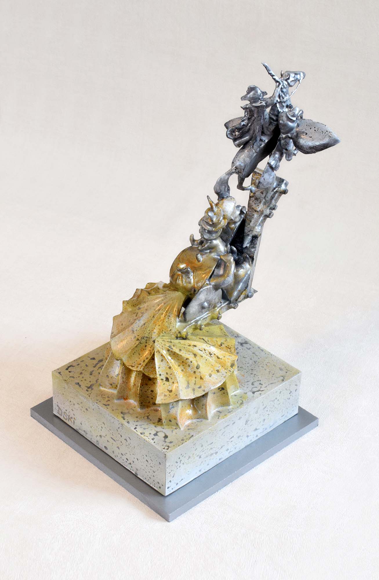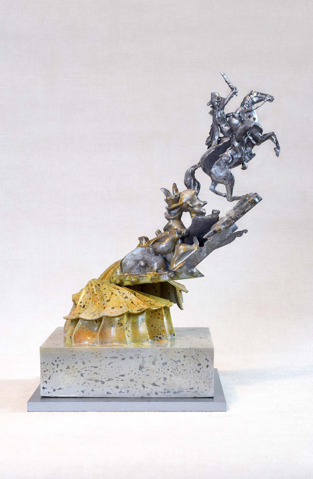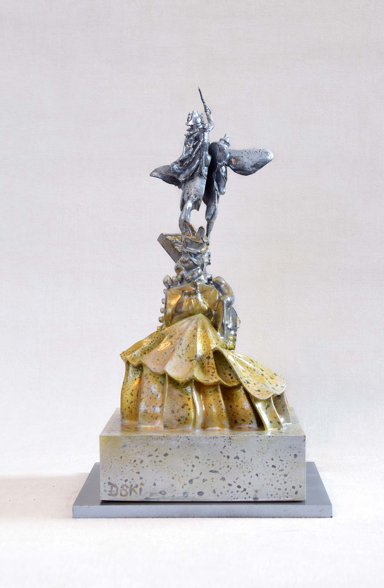 Presenting a striking sculpture that masterfully captures the dynamic tension between action and grace. This piece showcases a dramatic scene of a warrior on horseback (Napoleon Bonaparte), embodying strength and valor, while the base elegantly undulates in shimmering gold tones, symbolizing energy and movement. The intricate detailing of the figures, set against a textured stone-like pedestal, adds depth and a sense of history to the artwork. Crafted from plastic and epoxy resign, this sculpture not only serves as a captivating visual focal point but also a testament to the skill and creativity of its artist. It invites viewers to reflect on themes of bravery and adventure, making it a perfect addition to any collection.