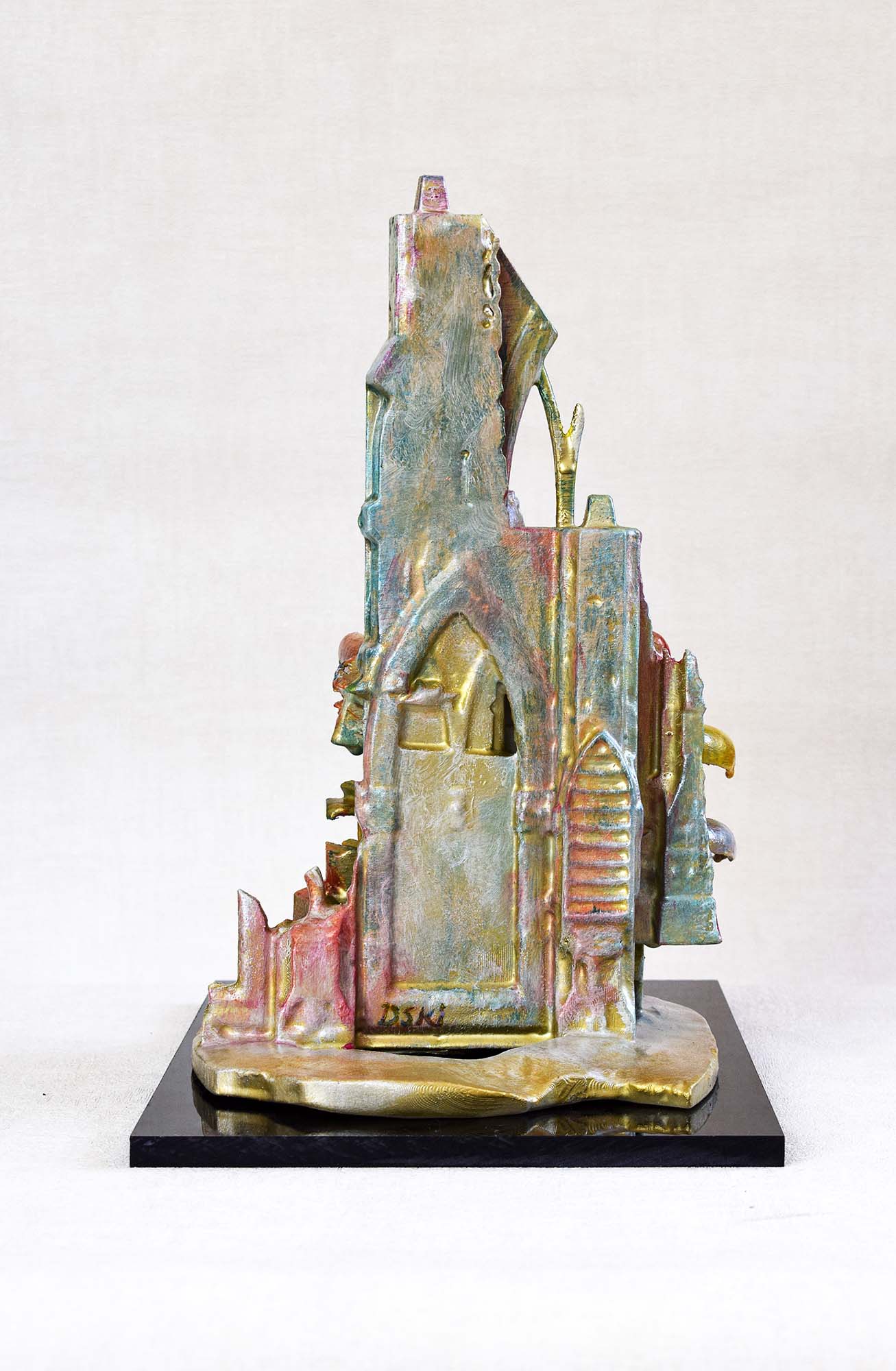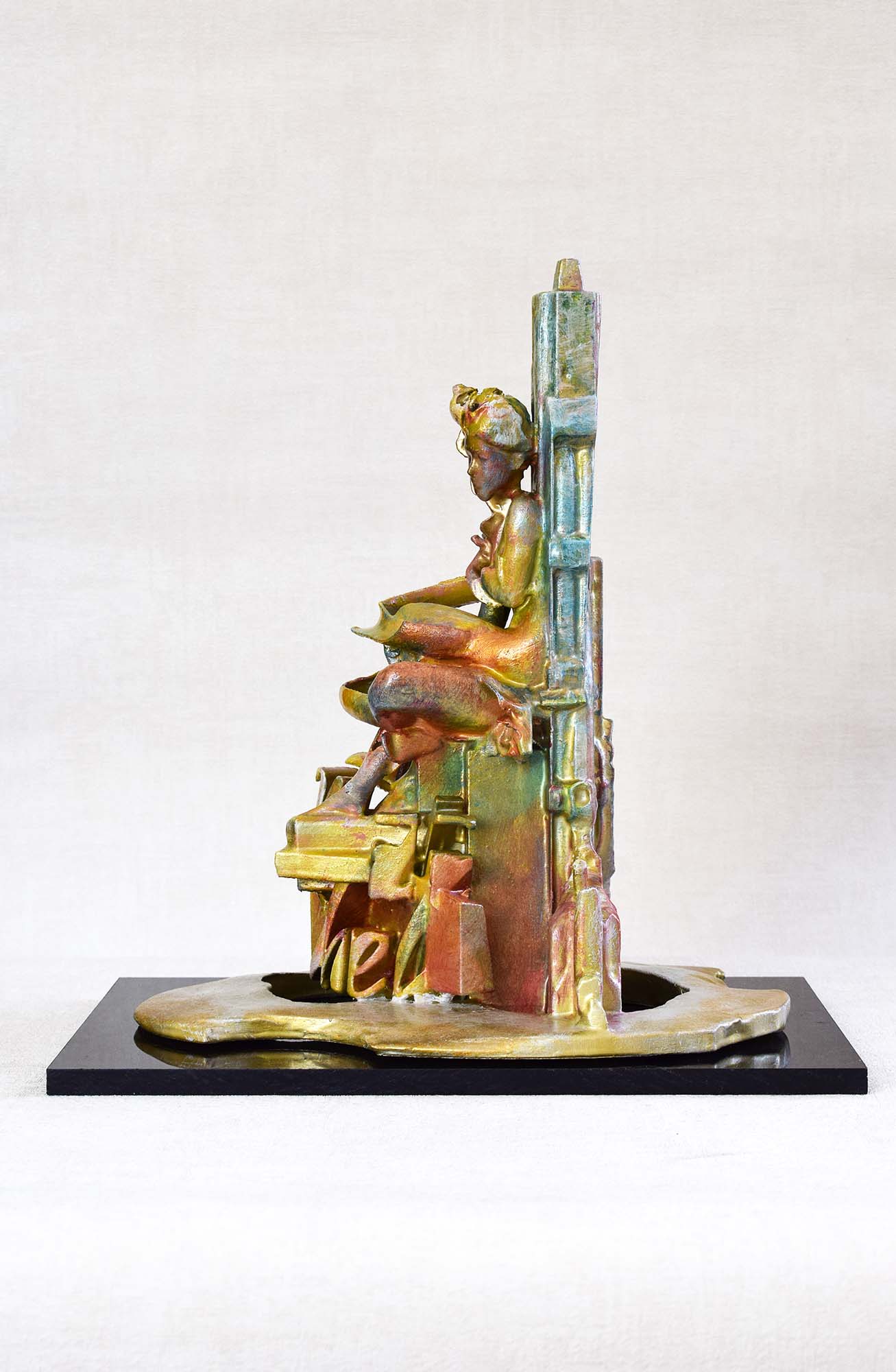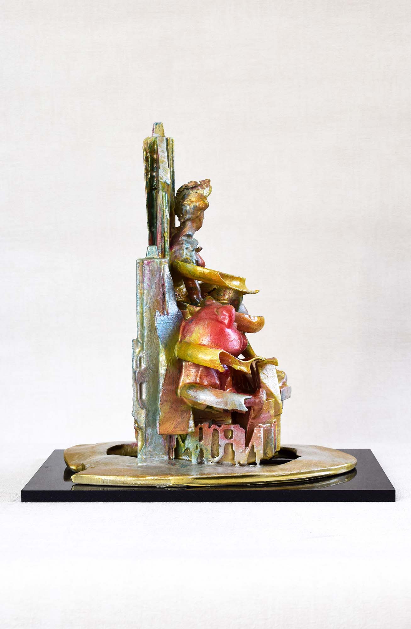 Introducing a stunning sculpture that masterfully blends form and emotion, this captivating piece stands as a testament to the power of human connection and creativity. Crafted from a harmonious mix of metallic hues—rich golds and deep blues—this artwork has been intricately designed to evoke a sense of movement and harmony. Its sleek, curved base gives the impression of rising, symbolizing aspiration and progress, while the striking figures entwined above convey a powerful narrative of companionship and unity. The artist's adept use of materials not only adds a tactile quality but also invites viewers to explore the interplay of light and shadow across its surface. Perfect for modern spaces or as a centerpiece in a collection, this sculpture is not just art; it’s a conversation starter, a profound statement piece that resonates with anyone who values the beauty of human experience.