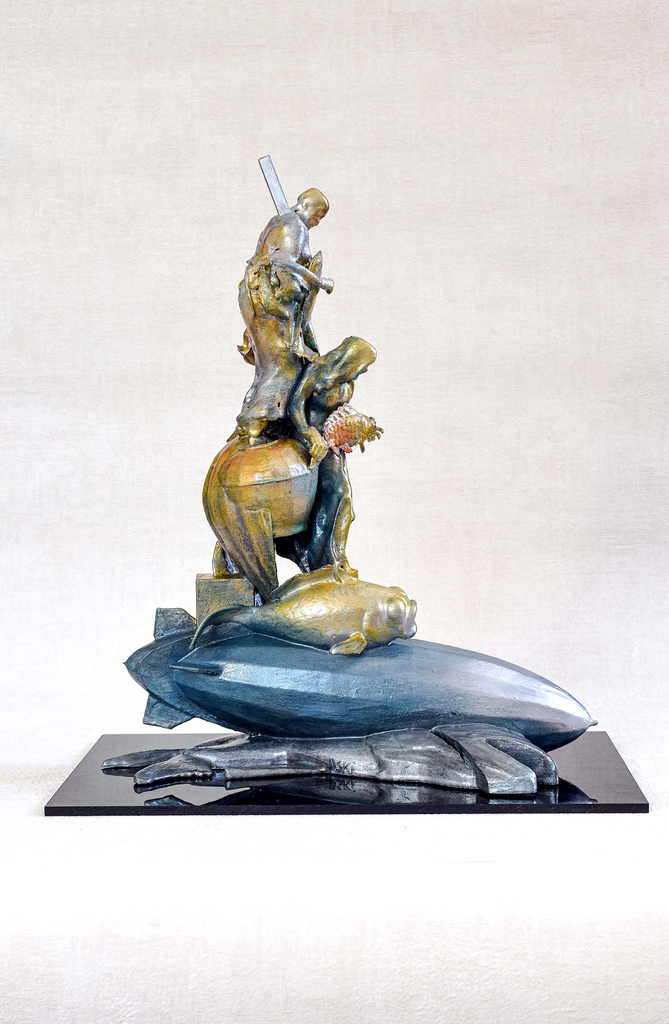 Introducing a stunning sculpture that masterfully blends form and emotion, this captivating piece stands as a testament to the power of human connection and creativity. Crafted from a harmonious mix of metallic hues—rich golds and deep blues—this artwork has been intricately designed to evoke a sense of movement and harmony. Its sleek, curved base gives the impression of rising, symbolizing aspiration and progress, while the striking figures entwined above convey a powerful narrative of companionship and unity. The artist's adept use of materials not only adds a tactile quality but also invites viewers to explore the interplay of light and shadow across its surface. Perfect for modern spaces or as a centerpiece in a collection, this sculpture is not just art; it’s a conversation starter, a profound statement piece that resonates with anyone who values the beauty of human experience.